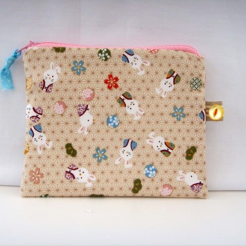 Cute little rabbits in kimonos credit card / coin purse with contrasting ribbon, zip, beige lining and button tag