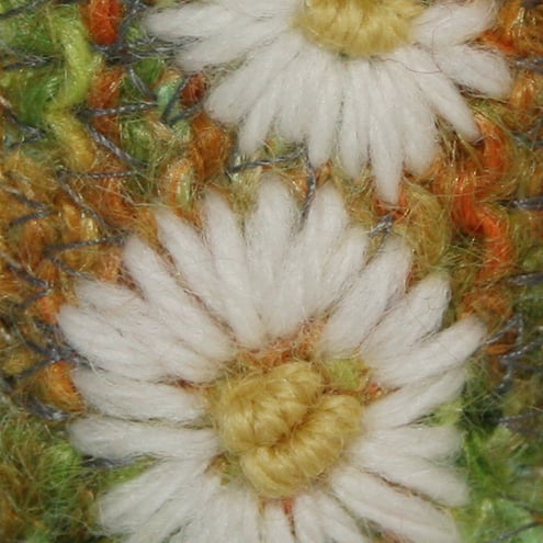 The background has been knitted in a mohair yarn and then fulled, or felted, to give a closer texture, This knitted background has then been machine basted to a thick wool fabric. The daisies have been embroidered using a combination of straight stitch, French knots and bullion stitch. The design is framed with a row of couching over a random dyed yarn.