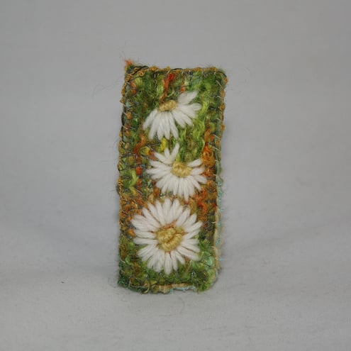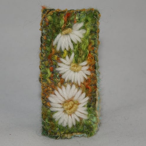 Daisies are embroidered in tapestry wools, against a hand knitted and felted background, to form this pretty brooch.