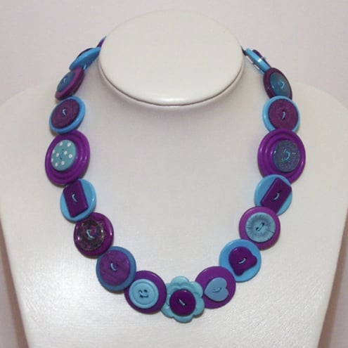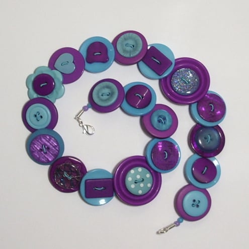 This distinctive button necklace is rich with an assortment of purple and turquoise buttons. These are threaded onto jewellery wire, which secures at the end with a silver plated lobster clasp fastener.