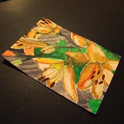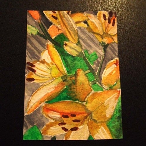 This is a tiny little ACEO original watercolor painting of orange lillies