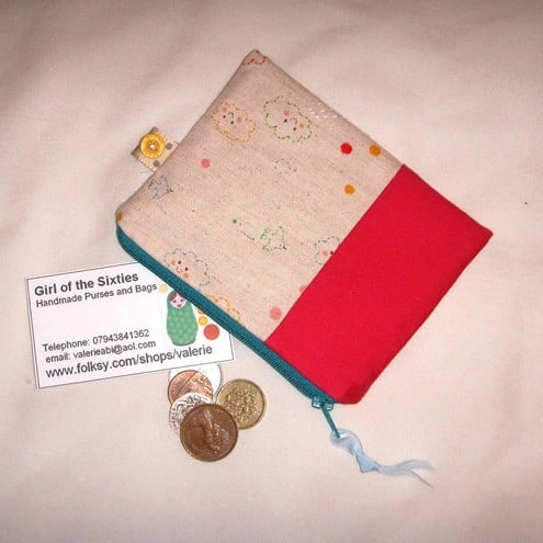 Cute little coin purse with contrasting zip, ribbon and lining. Perfect for your coins, credit cards and all the little things hanging around in the bottom of your handbag.