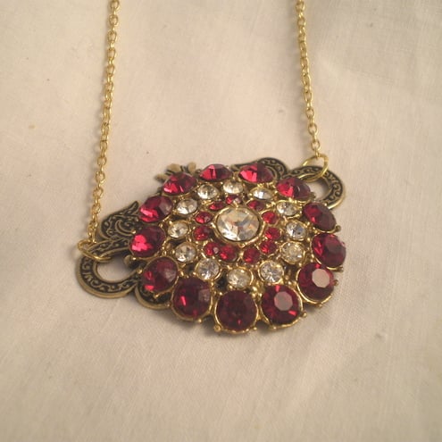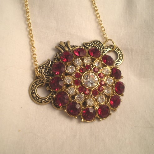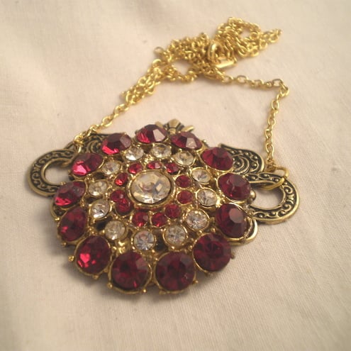 This delicious Victorian style Valentine necklace has been created from a vintage Czech glass brooch as the focal point and placed on an ornate antiqued goldtone stamping.
