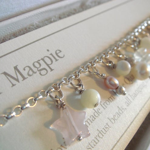 From the sterling silver chain hangs rose quartz stars, moonstone stacks, mother of pearl beads, freshwater pearls and silver stardust beads.