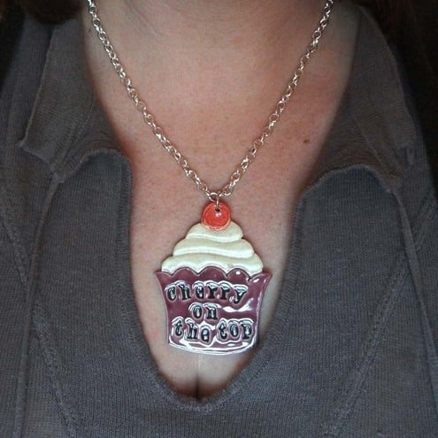 mmmmm, yummy - a cupcake pendant with the words "cherry on the top"