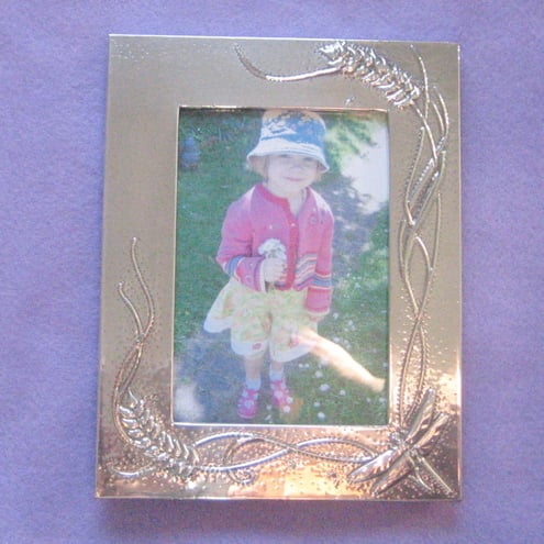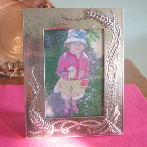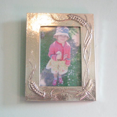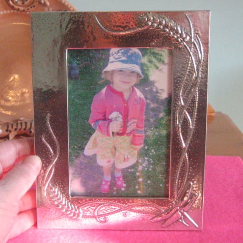 This striking frame has been hand-made in shiny modern lead-free pewter.It measures 134 x172mm overall, and the aperture is 79 x118mm.It is backed in black velour, and there is a stand and a hook for hanging.If you buy more than one item from me, excess postage will be refunded via Paypal.