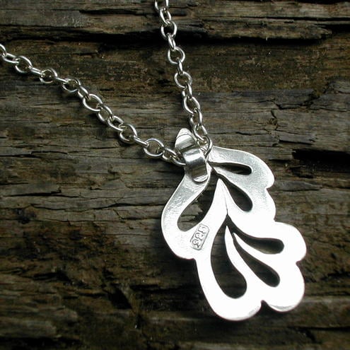 This botanically inspired pendant was hand cut from sterling silver sheet to create an eye catching sillohette, then given a polished finish.