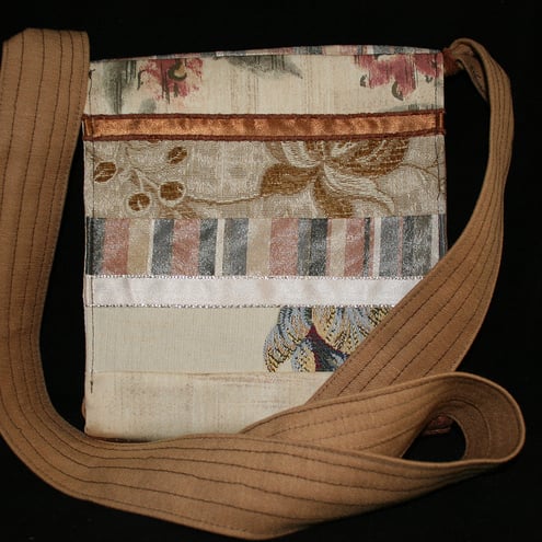 A piece of patchwork in shades of cream, with highlights of peach, pink and slate grey, forms the body of this practical bag. The strap is long enough to be worn across the body.