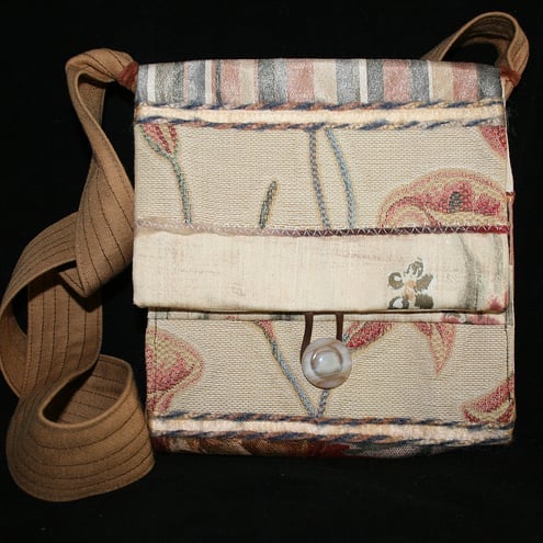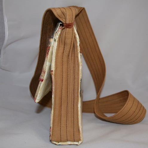 The bag is lined with a cream patterned fabric containing a separate pocket. The body of the bag is reinforced with heavy weight interfacing. The bag strap is formed from a tan fabric. The strap is attached down the sides of the bag to form the gussets. It is 'pinched in' at the top of the bag by a binding in chenille yarn, before continuing to form the strap. The bag closes with a loop over a vintage button.