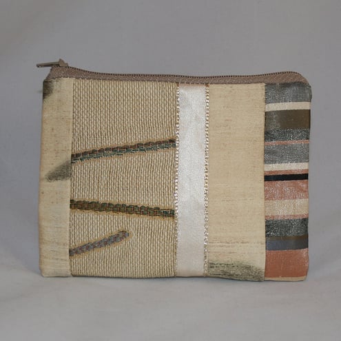 The patchwork has been embellished with ribbon. The purse closes with a zip and is lined with a cream patterned fabric, also matching that used for the coordinating bag. The patchwork has been backed with interfacing to give the purse strength and rigidity. This purse is suitable for coins, cards, cosmetics or other small items. It could also be used for small gadgets - eg ipod and earphones.
