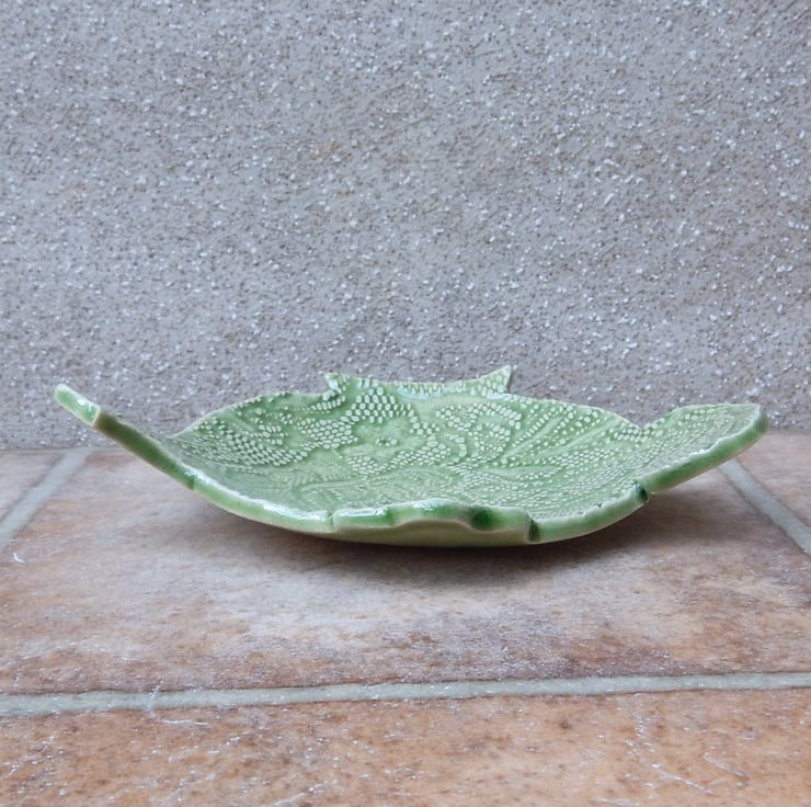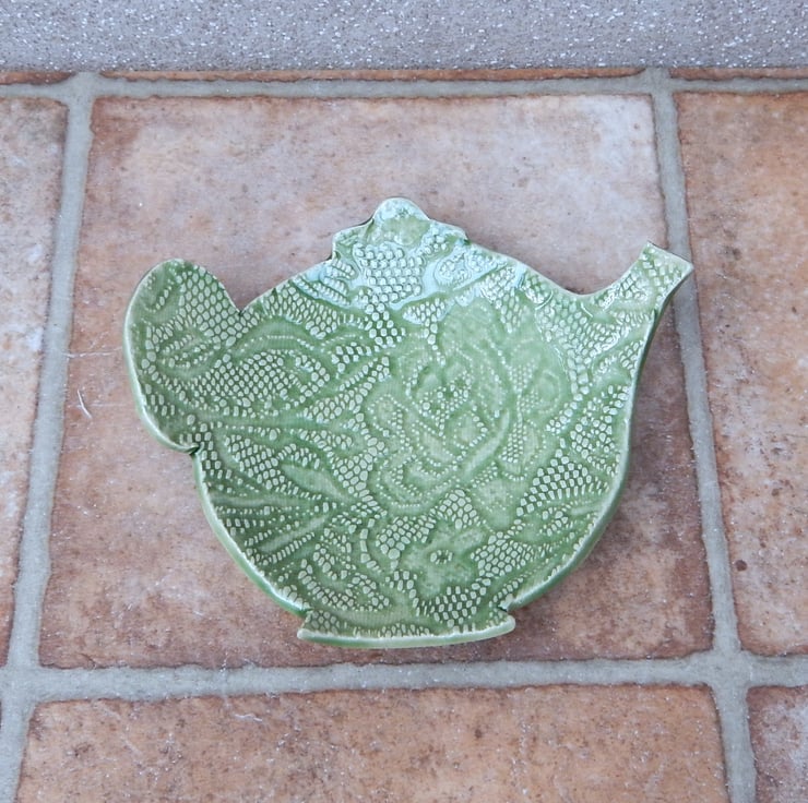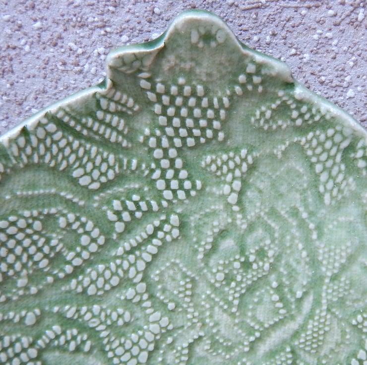 Useful for either discarded teabags or as a soap dish, I made this tea bag holder from a rolled out piece of strong white stoneware clay and added some lace texture. I have finished it in a lovely light green glaze.