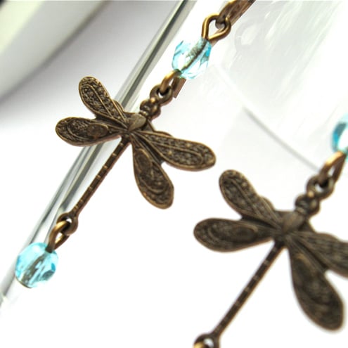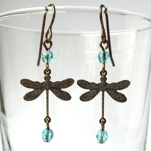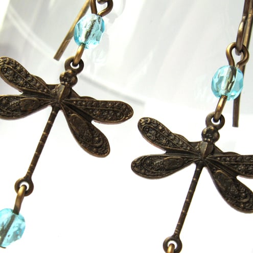Handmade earrings with beautiful little pure brass dragonflies, and tiny glass crystal beads.