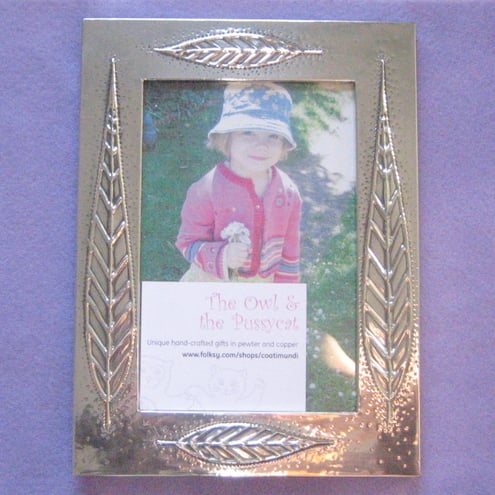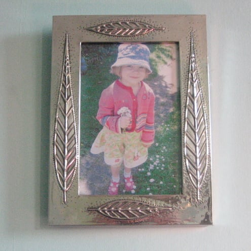 This striking frame has been hand-made in shiny modern lead-free pewter.It measures 146 x 197 overall, and the aperture is 91 x 142mm.It is backed in black velour, and there is a stand and a hook for hanging.If you buy more than one item from me, excess postage will be refunded via Paypal.