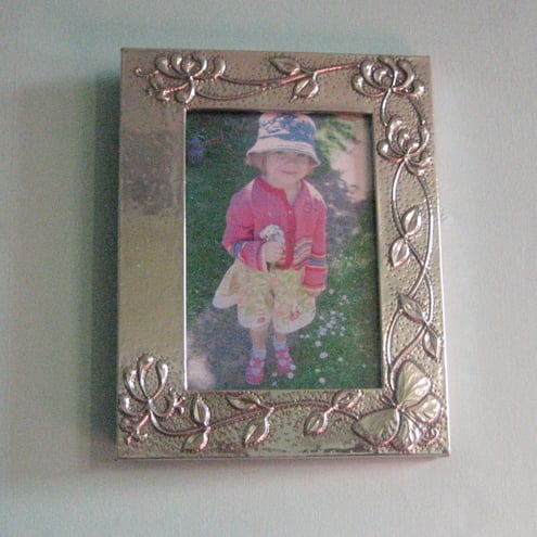 This striking frame has been hand-made in shiny modern lead-free pewter.It measures 134 x172mm overall, and the aperture is 79 x118mm.It is backed in black velour, and there is a stand and a hook for hanging.If you buy more than one item from me, excess postage will be refunded via Paypal.