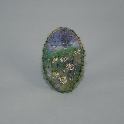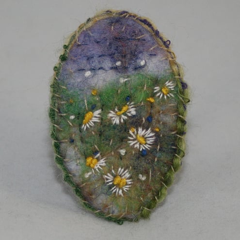 Cheerful daisies are at home on the felted meadow background of this embroidered brooch.
