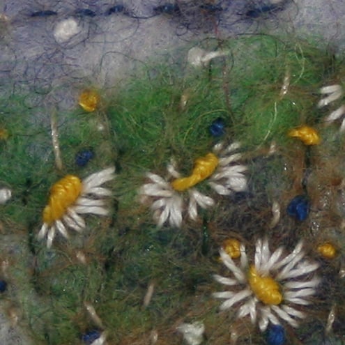 Naturally died silk and mohair fibres are combined with merino wool, in the felt which forms the background to this brooch. The daisies are embroidered in cottons