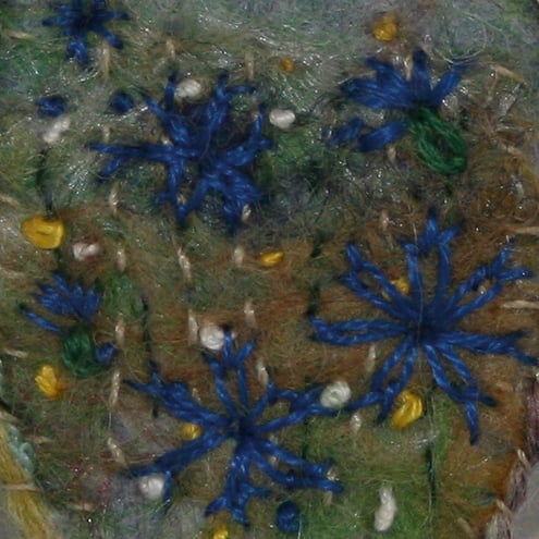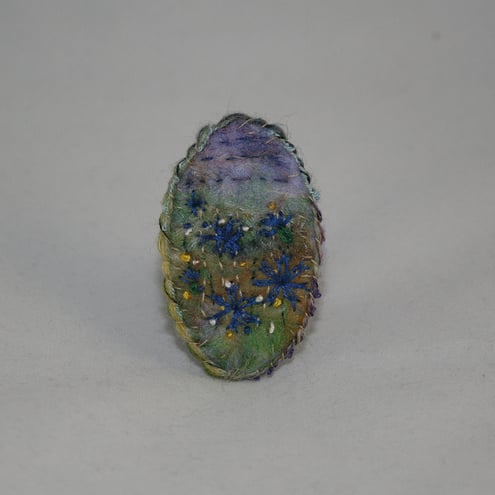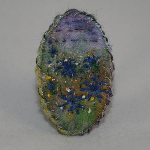 The cornflower blue contrasts with the hand-felted, meadow background of this embroidered brooch.