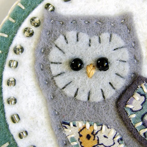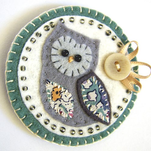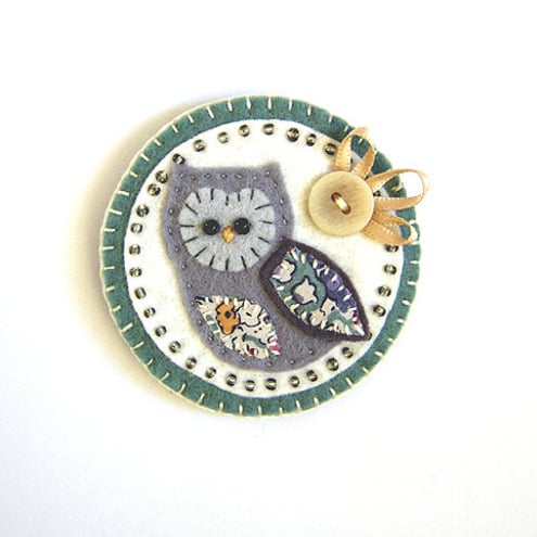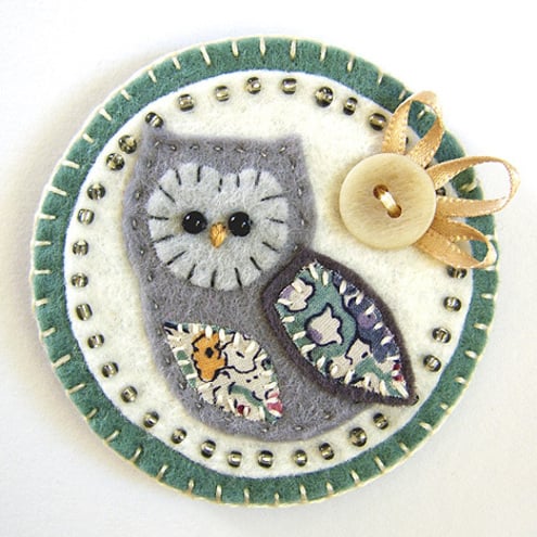 It features a little owl with appliqued wing and belly in pretty Liberty print fabric. It is mounted onto a cream circular felt base which is edged with pretty coordinating seed beads. It is further mounted onto a green felt backing and is finished with a button and ribbon detail. It has a brooch backing for easy attachment.
