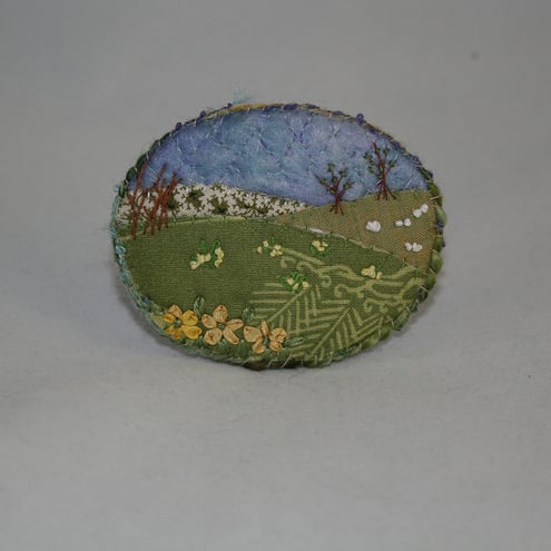 The background of the brooch has been hand appliqueed, with details added by embroidery. The primroses have been added by embroidery, those at the back of the group are worked in a fine thread, those in the centre in several strands of embroidery thread and those in the front are stitched in silk ribbon - this gives depth to the design. French knots suggest sheep on the distant hillside and the leaves are just bursting open on the trees. A row of couching over a mixed greens and golds yarn frames the design.