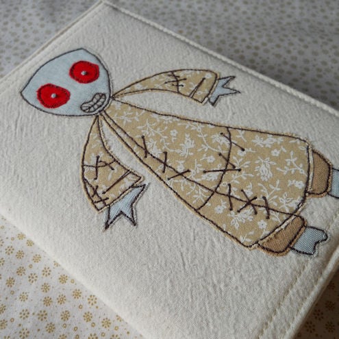 the zombie is in a neutral printed floral cotton fabric, which is appliqued onto pre-washed calico, before being "drawn" on with free machine embroidery, and features hand embroidered eyeballs.
