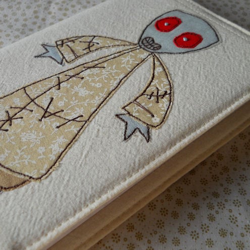 this embroidered fabric notebook features a cute and/or scary zombie tiptoeing toward you on the front cover.