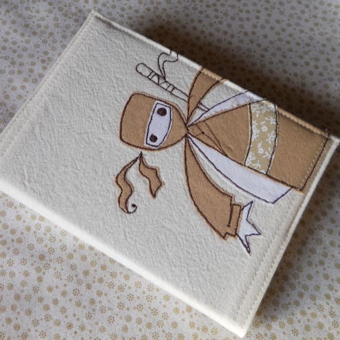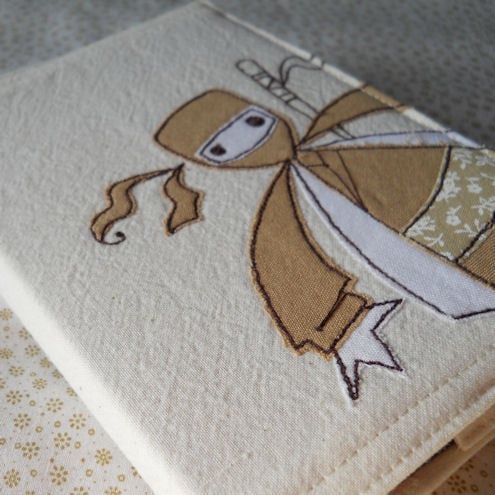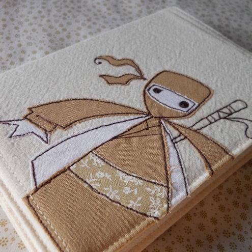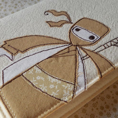 the ninja is in a beige, white and neutral printed-floral cotton fabric, which is appliqued onto pre-washed calico, before being "drawn" on with free machine embroidery.