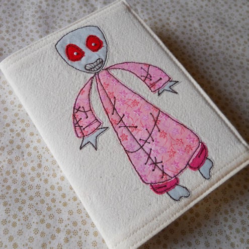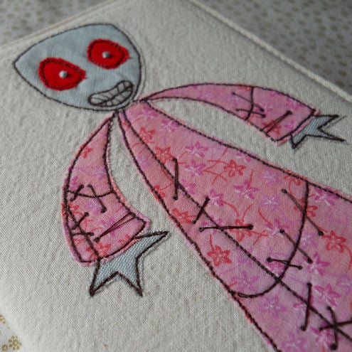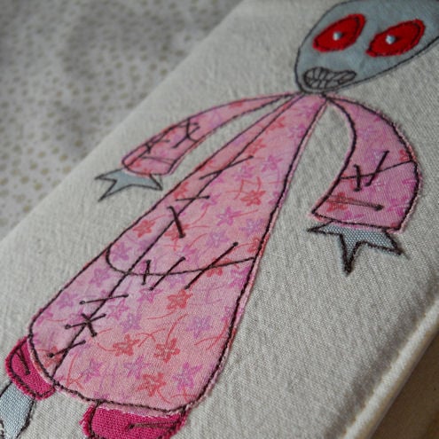 this zombie is in pink printed cotton fabric, which is appliqued onto pre-washed calico, before being "drawn" on with free machine embroidery, and features hand embroidered eyeballs.