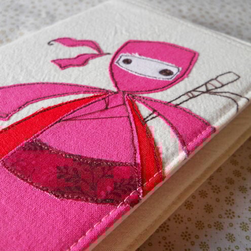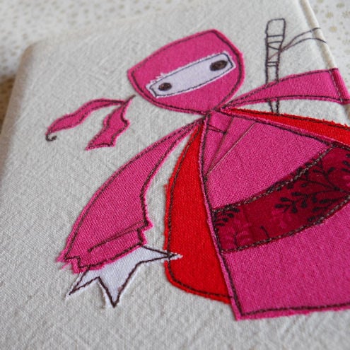 this ninja is in a pink, red and deep pink floral-printed cotton fabric, which is appliqued onto pre-washed calico, before being "drawn" on with free machine embroidery.