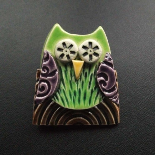 This cute little ceramic owl brooch is made from white earthenware clay and is coloured with rich, glossy glazes.