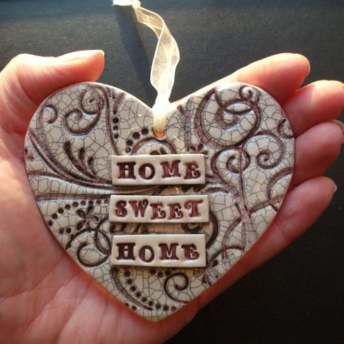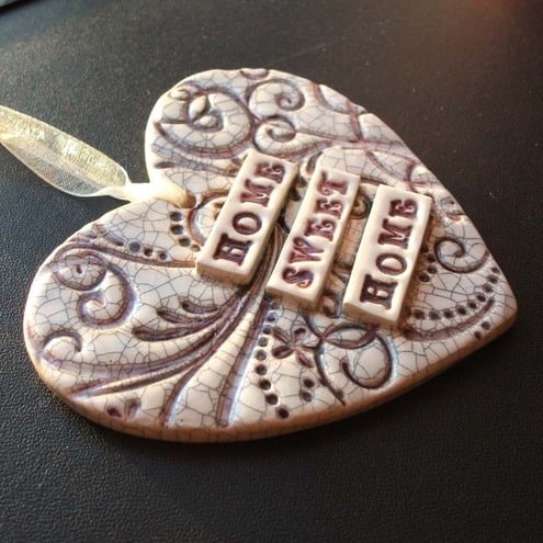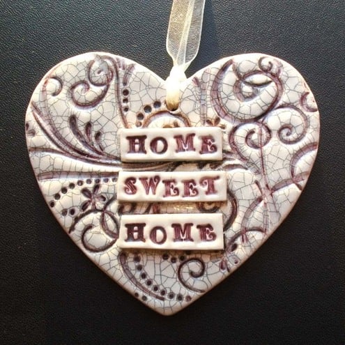 This ceramic heart is made from white earthenware clay and decorated with the words "Home Sweet Home" It has a purple swirly background finished off with a crackle glaze for a shabby chic look.
