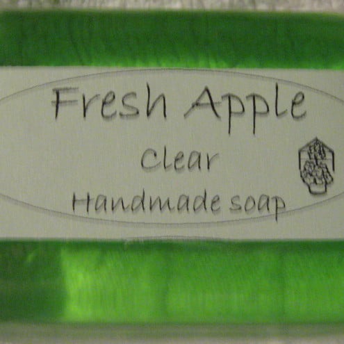 A bar of refreshing Apple scented Glycerine based soap individually wrapped in clear cellophane. All ingredients are listed on the label. All soaps comply with EU regulations and certification. Minimum weight 80 gms