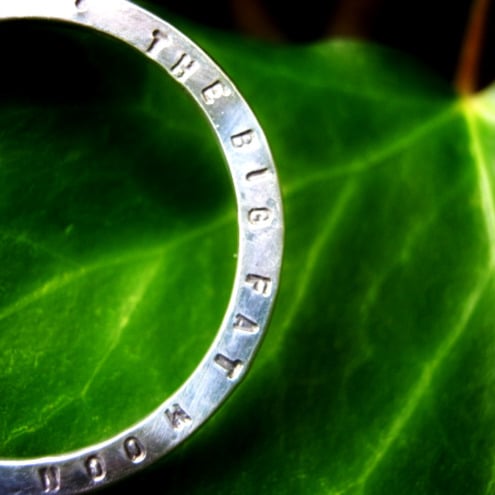 The simple sterling silver ring hangs from a 45cm chain. After forging the ring I push it through my rolling mill to flatten, then it is hand-stamped with teeny-tiny 1.5mm letters.