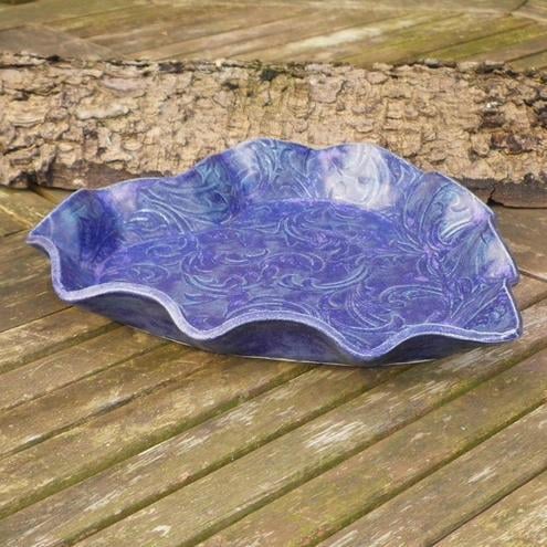 This heart shaped dish was made with a rolled slab of strong white clay which I have added a leafy texture to.