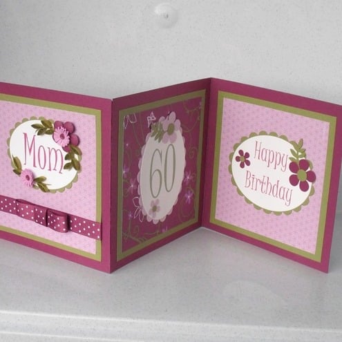 Each panel of the card measures 5" x 5" approx. The front panel is decorated with quilling flowers and foliage, the other panels are adorned with punched flowers, all in pretty shades of plum and olive green.