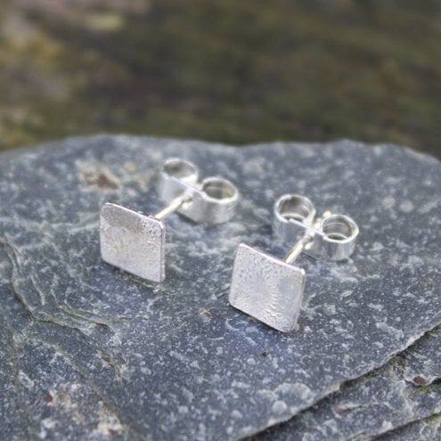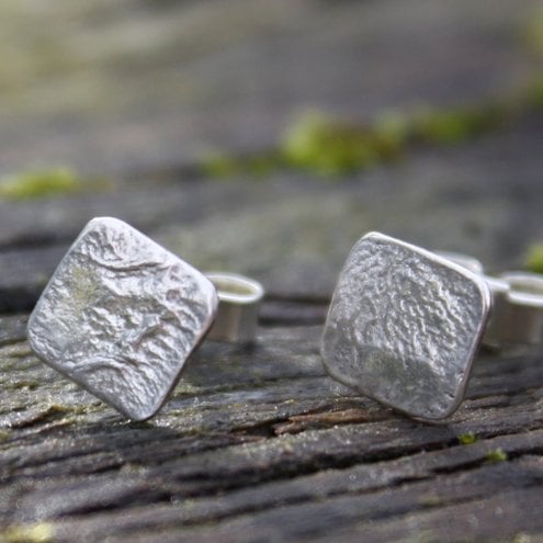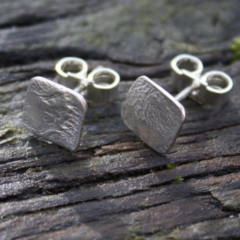Tiny square heat textured (reticulated) sterling silver stud earrings.