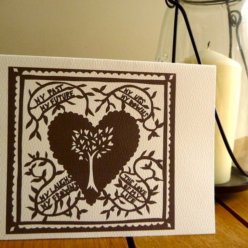This is a lovely print of an original papercut design hand cut by myself. It is printed on white cards which has a slight texture.