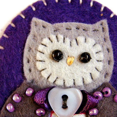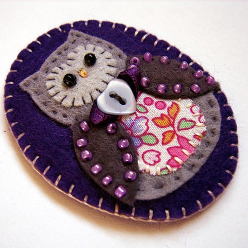 It features a little grey felt owl with applique in pretty cotton print fabric and beading detail on the wings. It is mounted onto a purple oval felt base and is finished with a pretty heart button and ribbon detail. It has a brooch backing for easy attachment.