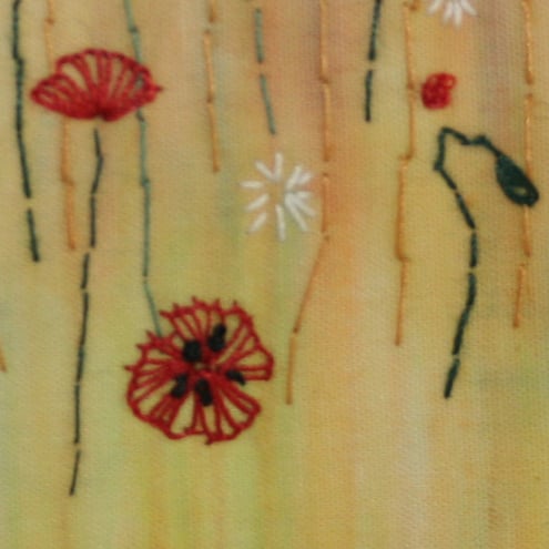 Corn grass, in shades of browns and golds, has been hand drawn onto cotton fabric using water soluble crayons. This has then been water-brushed, to blend, and heat set. The fabric has then been bonded to woven interfacing and embellished with hand embroidery, representing distant daisies and poppies. Poppies in the foreground are stitched in more detail. A final piece of interfacing has then been bonded to the back of the piece, which is signed and dated.