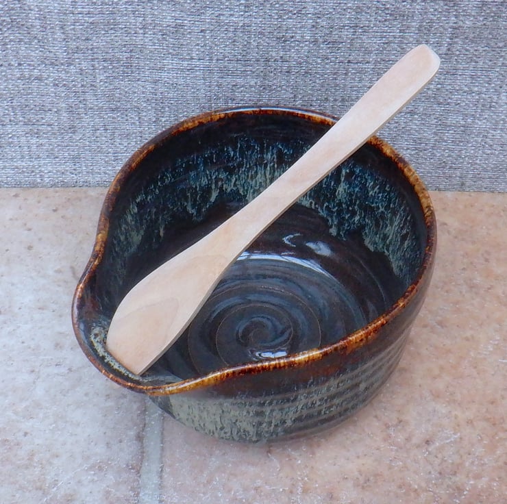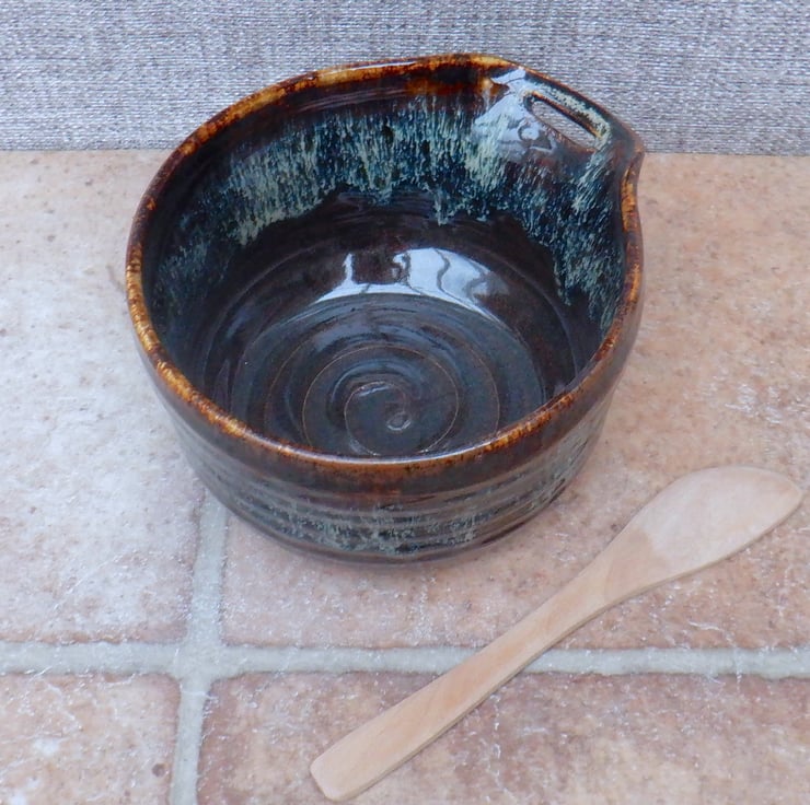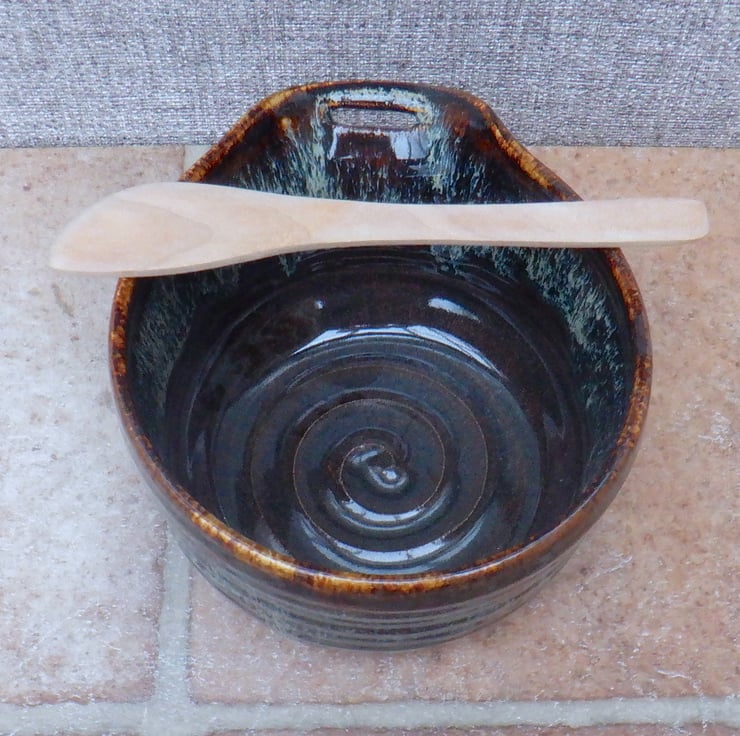 This bowl was thrown on my pottery wheel using strong ivory stoneware clay, and finished in a lovely dark chocolate brown with a runny cream glaze over the top.