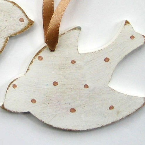 The 2 swallows are made of wood, and decorated in white with a "distressed" Shabby chic appearance. They are decorated with taupe spots. They are strung with matching satin ribbon and can be tied to a cot or door hanger.