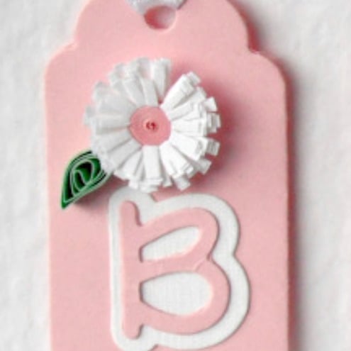 Measuring 6" x 4" approx. this card features four mini tags adorned with quilled daisies and die cut letters spelling "baby". This card is also available in pale blue for a baby boy or cream, lemon or pale green for a unisex card.