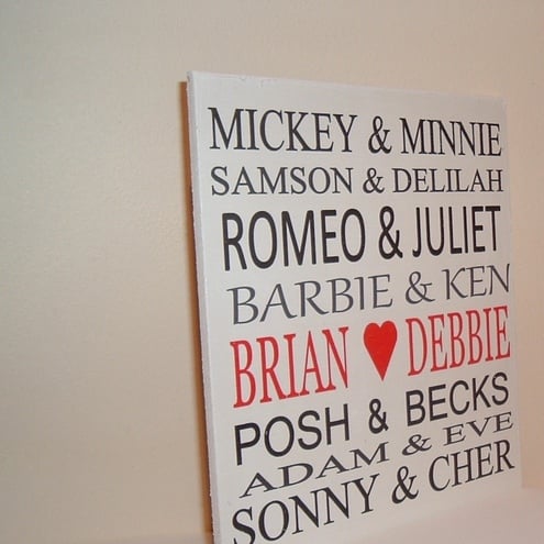 handcrafted wooden plaque/sign ready to hang with natural jute, approx 8 x 8 inch any 8 couples names with one highlighted red, other lettering black/soft black/grey very unusal picture hanging plaque for that special couple. you can pick any 8 pairs of names and in the order you wish to be listed.many thanks