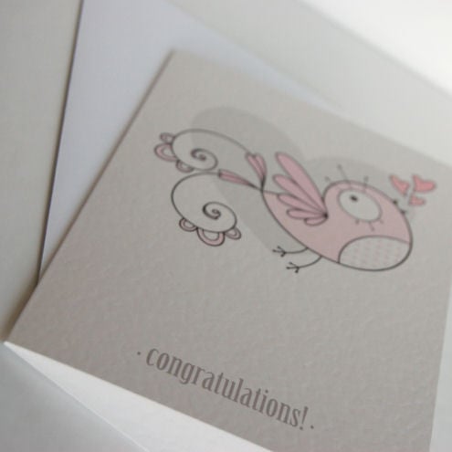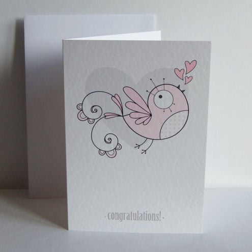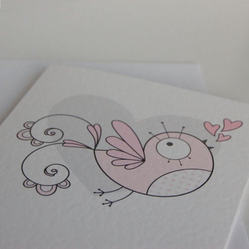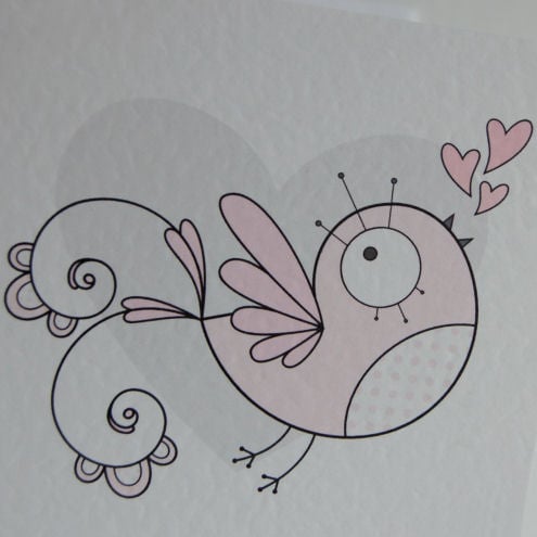 unique and quirky illustrated card, featuring a pale pink bird with a spotty tummy, singing a song of hearts and love. could be used to celebrate a new baby - or when congratulations are in order for any occasion, really!