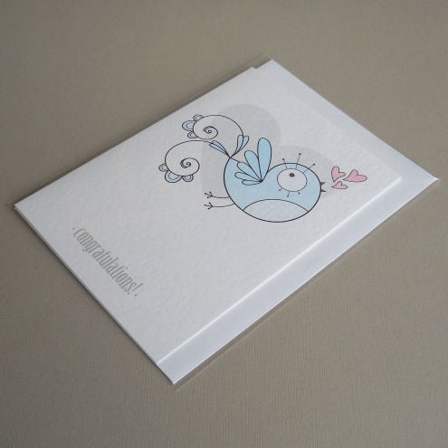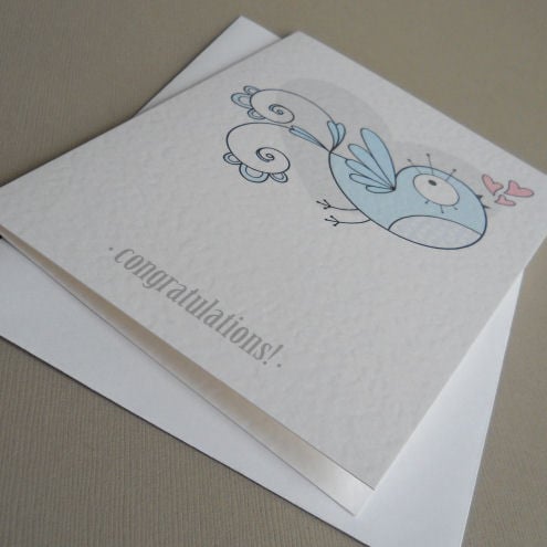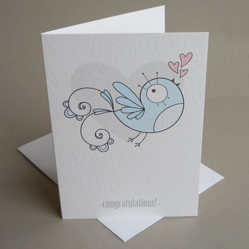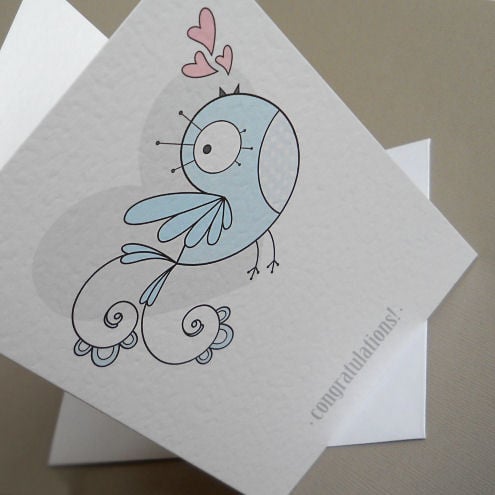unique and quirky illustrated card, featuring a pale blue bird with a spotty tummy, singing a song of hearts and love. could be used to celebrate a new baby - or when congratulations are in order for any occasion, really!
