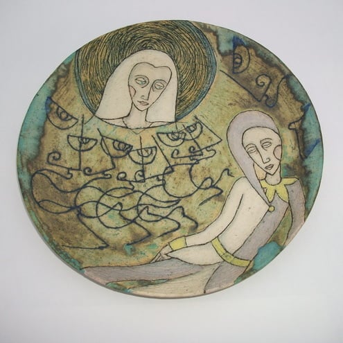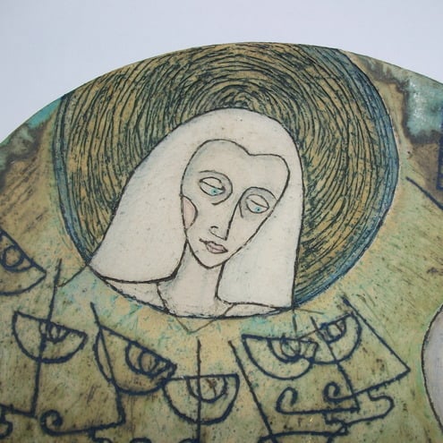 This plate is made from textured stoneware clay and the imagery is etched into the surface. This is then decorated with various oxides, slips and glazes.