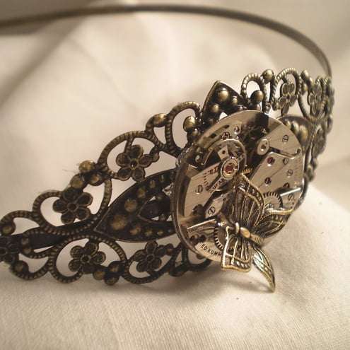This intricate Steampunk antiqued brass filigree head band has been created from a gleaming vintage pocket watch movement and adorned with a whimsical butterfly charm.