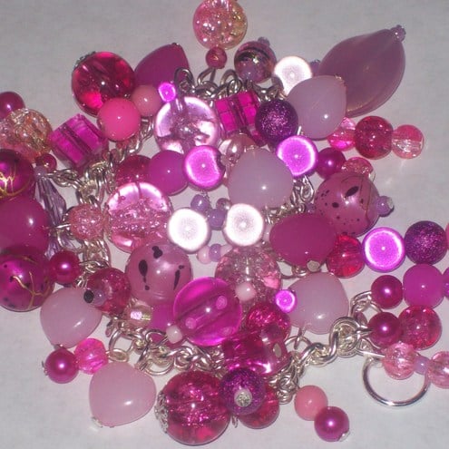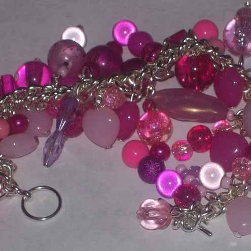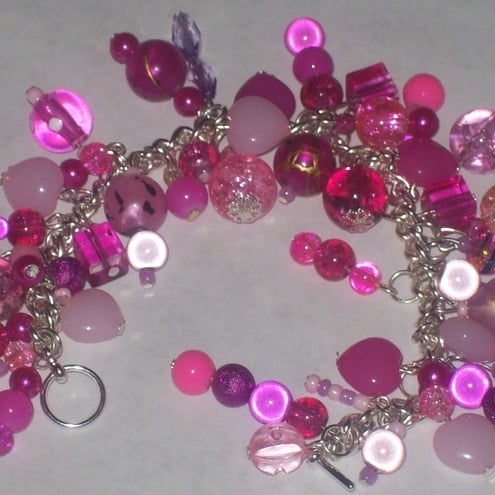 Silver plated bracelet measure approx 23 centimeters with a T bar clasp. Hand crafted. It is filled with a variety of quality beads in diffrent shapes and sizes. Based on an pink candy sweet theme. The bracelet looks completly stunning on! It is a gaurenteed 1 of a kind item.