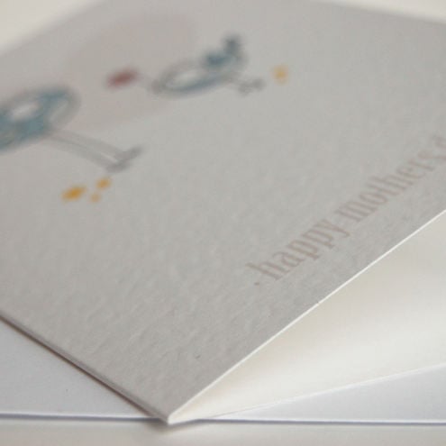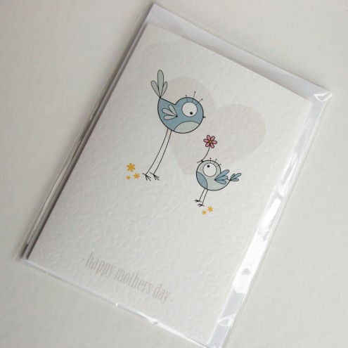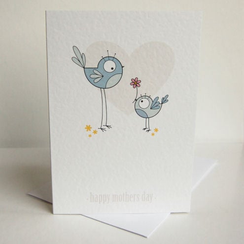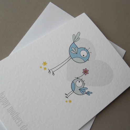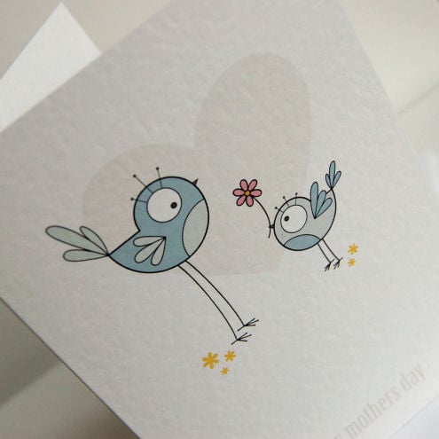 unique and quirky illustrated card in shades of blue, featuring a little bird giving mamma bird a pink flower. little bird thinks it's nice to thank mum for all she does!