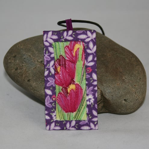 Simple hand embroidery has been used to accentuate the floral pattern hand painted onto plain white cotton to form the central panel of this crocus design. Backed with interfacing, and the edges turned under, this embroidered panel is then slip-stitched in place in the centre of the pendant.
