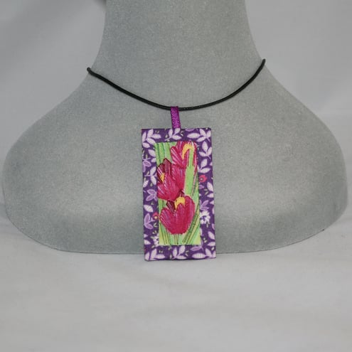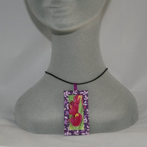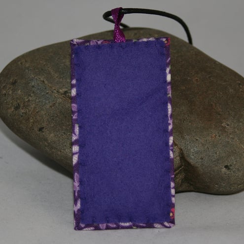 Purple patterned cotton fabric covers a piece of heavy interfacing. The pendant is backed with black felt. A small coin is securely stitched within the backing of the pendant. This provides a little weight so that the pendant hangs correctly, without being too heavy. A ribbon loop is securely stitched in place from which to suspend the pendant. A length of black waxed cord is threaded through the ribbon. This may be cut to the desired length. The cord is knotted to fasten the pendant.